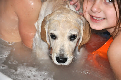And this could be a low parenting moment for me…..bathing the dog with the small children. But at least the dog smells better. I’m not sure about everyone else. And there is water EVERYWHERE. Everywhere, I tell you.